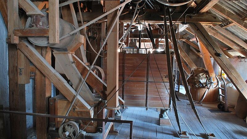 Die Dorfmühle ist die letzte von ehemals sieben Mühlen entlang des Modenbachs, die bis heute mit Wasserkraft betrieben wird und vollständig eingerichtet und funktionsfähig ist.