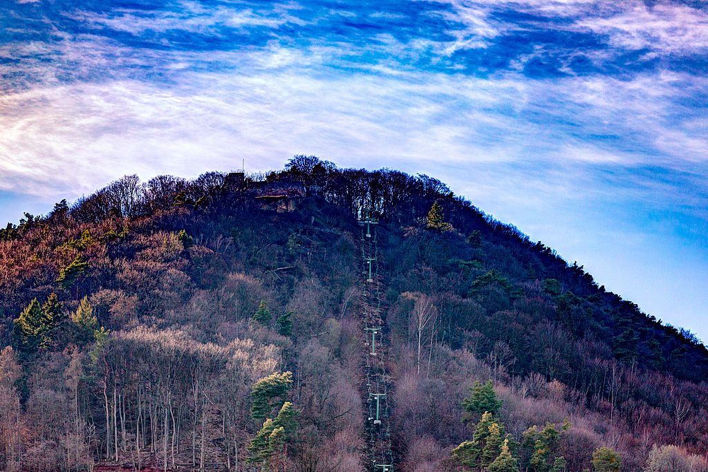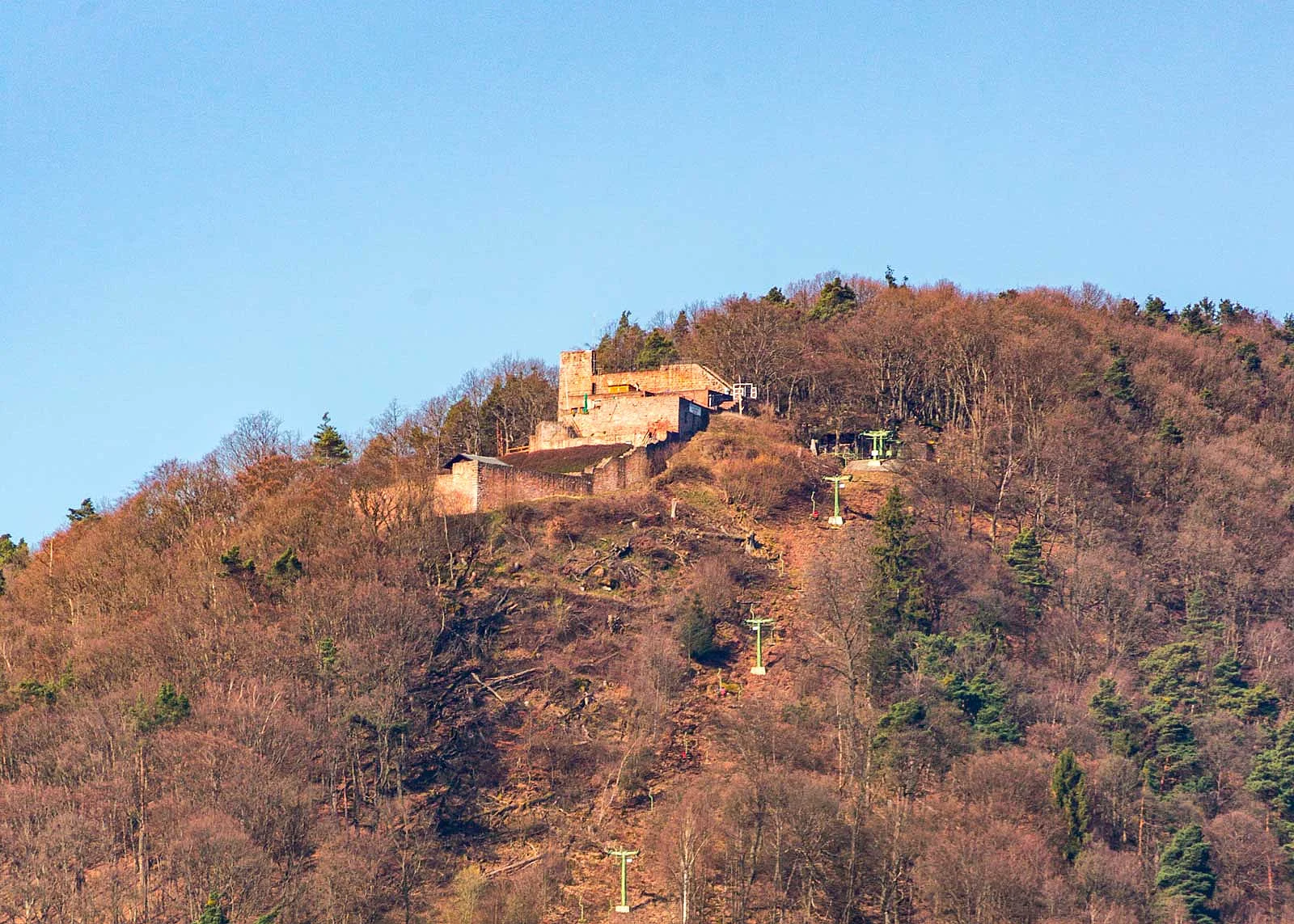 Von der Talstation beim Schloss „Villa Ludwigshöhe“ führt die erste pfälzische Sesselbahn 560 m hinaus zur Burgruine Rietburg mit Höhengaststätte.