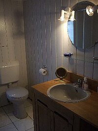 Das Bad mit Badewanne und Duschabtrennung, Waschmaschinen-Mitbenutzung.