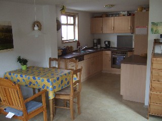 Komplett eingerichtet Küche, mit Spülmaschine, Kühlschrank, TK-Schrank, Herd mit Ceran-Feld, Mikrowelle, Dunstabzugshaube, Kaffemaschine, Esspressomaschine, Toaster, offene Verbindung zum Esszimmer.