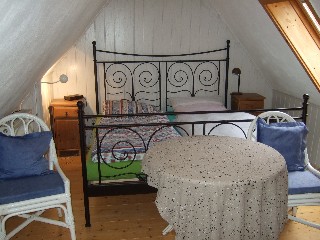 Im Obergeschoss finden Sie zwei getrennte Schlafzimmer, eines mit Doppelbett, das andere mit zwei Betten. Neue Matrazen, Kopfteil verstellbar.